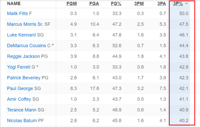 快船本赛季的三分表现突出,在于他们集体都准。赛季至今,快船一共有19名球员上场打过比赛,在这19名球员里,竟然有11名球员的三分命中率至少达到40%!其中,场均至少出手4次三分球的小莫里斯、雷吉、乔治和巴图姆,都有至少40%的三分命中率。小卡的三分命中率高达39.6%,却只能排在19名球员的第12位,而这已经是小卡生涯三分第二准的赛季了。
