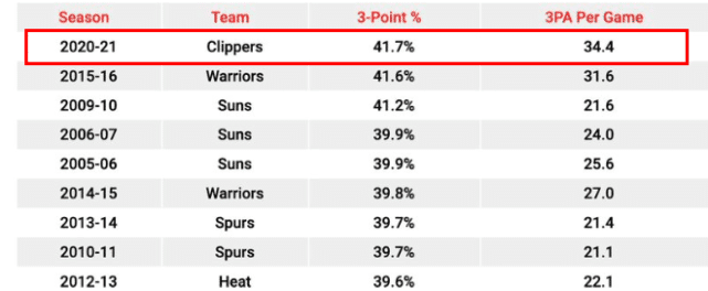 来源:直播车05-08 11:21直播车讯快船还剩5场常规赛,他们有望打破一项三分纪录,成为NBA历史上单赛季三分最准的球队!赛季至今,快船场均三分出手34.4次,命中14.4次,三分命中率高达41.7%,是全联盟唯一一支三分命中率超过四成的球队。