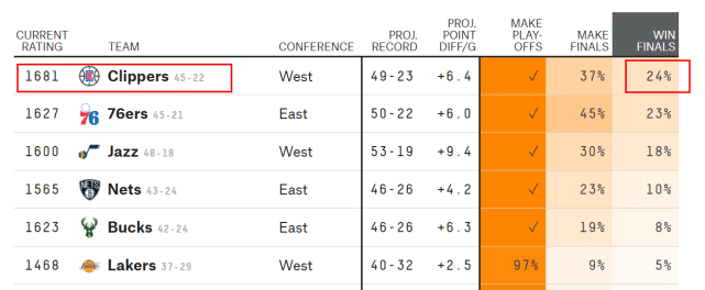 数据网站FiveThirtyEight列出了最新的夺冠概率,快船达到24%,依然处于领跑位置,包括快船在内,目前只有四支球队夺冠概率至少10%。其他三支球队依次是费城(23%)、爵士(18%)和篮网(10%)。上赛季冠军湖人的卫冕概率仅为5%。