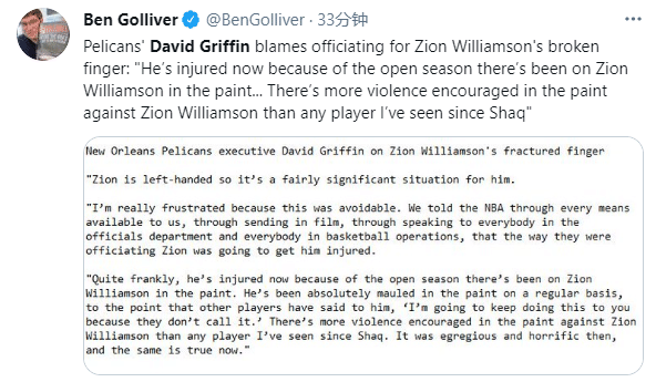鹈鹕高管大卫-格里芬回应锡安是如何受伤的?格里芬表示锡安受伤的部分原因是裁判过于纵容对手,锡安经常在禁区遭遇严重的犯规,甚至有些球员曾告诉锡安:我们会继续这样对付你,因为裁判不会吹的;格里芬还表示锡安是奥尼尔之后遭遇暴力犯规最多的球员。