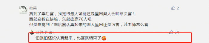 有球迷表达了自己的看法,“真到了季后赛,我觉得最大可能还是篮网湖人会师总决赛!西部变数在快船,东部雄鹿和费城。但感觉季后赛认真起来的湖人篮网还是厉害”。