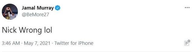 来源:直播车05-07 19:53直播车讯 北京时间5月7日,福克斯体育评论员尼克-怀特谈到了掘金球星约基奇。他认为约基奇今年大概率会拿下MVP,但是他可能是近35年最菜的MVP。结果,掘金球员贾马尔穆雷立刻在社交媒体上发表自己的观点,他直接评论:尼克-错误。(Nick wrong)