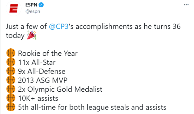 NBA官网晒出保罗身披太阳球衣的照片,并写道:“加入我们一起祝福太阳的保罗36岁生日快乐!”ESPN列出了保罗的一些生涯成就:最佳新秀、11次入选全明星、9次入选最佳防守阵容,2013年全明星赛MVP,2块奥运会金牌,10000+次助攻,抢断和助攻均进入历史前五。