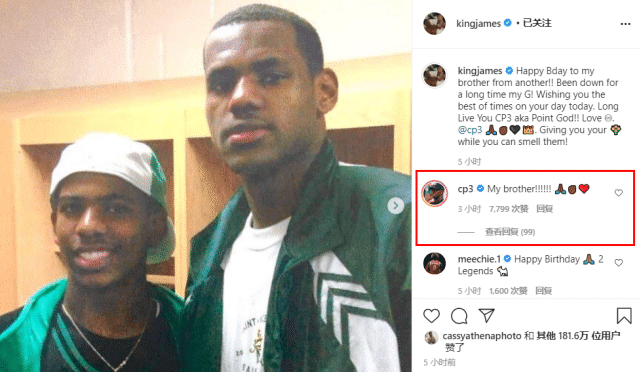 詹姆斯配文写道:“祝我的好兄弟生日快乐!为此准备了好久,我的兄弟!愿你今天拥有最美好的时光。CP3万岁,又可以称之为控卫之神!爱你无极限,把鲜花送给你,闻闻吧!”保罗也第一时间回复:“我的兄弟!”