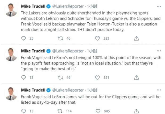 詹姆斯确定缺席和快船、开拓者的背靠背比赛,对于湖人来说,这是一个打击,毕竟湖人现在前6的排名并不稳固,一旦连败,他们很可能面临打附加赛的局面。至少现在看,詹姆斯可能不只是缺席这两场比赛,甚至常规赛的比赛都无法出场,这是一个很大的隐患。