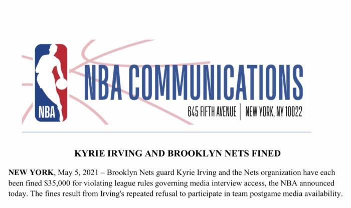 来源:直播车05-06 12:04直播车讯北京时间5月6日,NBA官方开出一笔重大罚单,篮网球星凯里-欧文和篮网队因违反联盟采访规定都被罚款35000美元,NBA官方声明罚款真因——欧文多次拒绝赛后媒体采访,不仅违规被罚款,还牵连篮网遭处罚,累计罚款7万美元。