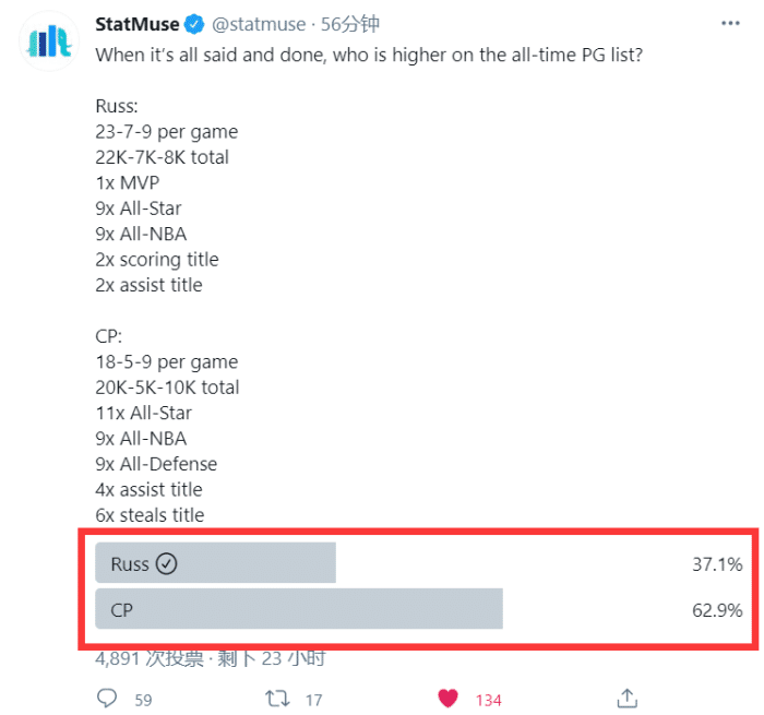 非常有意思的是,美媒statmuse发起了一项投票:当一切尘埃落定的时候,韦少和保罗谁在控卫榜单上的排名会更高?韦少目前生涯场均23分7板9助攻,生涯总共22000分7000板8000助攻,1次MVP,9次全明星,9次最佳阵容,2次得分王,2次助攻王。保罗生涯场均18分5板9助攻,生涯总共20000分5000板10000助攻,11全明星,9次最佳阵容,9次最佳防守阵容,4次助攻王,6次抢断王。