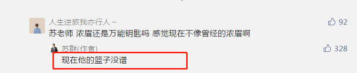 而苏群还点出了湖人的问题所在,就是戴维斯,他的投篮表现没谱,连最大杀招都没了。有网友表示,“苏老师,浓眉还是万能钥匙吗,感觉现在不像是曾经的浓眉啊”。而苏群回应,“他现在的篮子没谱”。