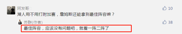 有球迷提问,“湖人用不用打附加赛,詹姆斯还能拿到最佳阵容吗”。苏群老师表示,“最佳阵容,应该没有问题,就看一阵还是二阵了”。