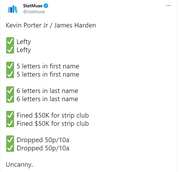 数据网站StatMuse发文调侃两位球星至少有五个共同点:其一,都是左撇子球员;其二,名字都是5个字母,Kevin和James;其三,姓氏都是6个字母,Porter和Harden;其四,都因逛夜店被罚了50000美元;其五,都砍下了至少50分10助攻的数据,不可思议。