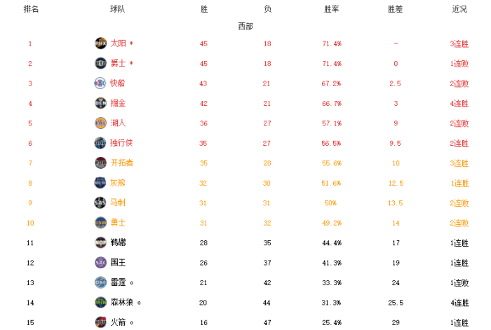 来源:直播车05-01 16:14直播车讯 北京时间5月1日NBA常规赛进行了8场比赛,其中有7支西部球队出战,其中包括了太阳21分大胜爵士,登顶联盟第一;马刺一度领先32分,却通过加时赛被凯尔特人逆转;灰熊大胜魔术、开拓者击败篮网、詹姆斯复出湖人不敌国王;接下来我们一起看看西部最新排名: