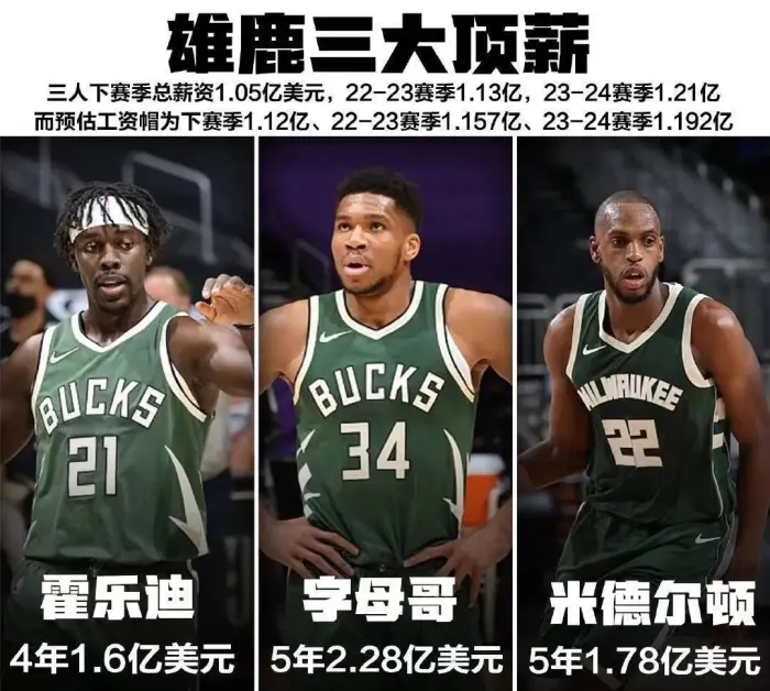 再加上字母哥的5年2.28亿美元超级顶薪,以及米德尔顿的5年1.78亿美元顶薪,NBA最贵三巨头就此诞生。