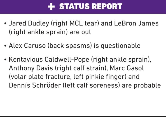 来源:直播车04-30 11:53直播车讯 北京时间4月30日,洛杉矶湖人公布下一场对阵国王的伤病报告,勒布朗-詹姆斯因脚踝扭伤继续休战,卡鲁索被列为出战成疑,浓眉(小腿拉伤)、波普(脚踝扭伤)、小加索尔(手指骨折)和施罗德(小腿酸痛)都是大概率出战。