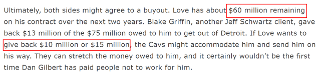 操作方式大概是乐福效仿格里芬(放弃1300万),扔掉1000万或1500万,那骑士就应该很乐意和他达成买断协议,其就可以自由选择去自己理想中的队伍效力。