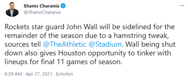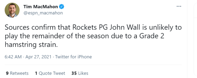 来源:直播车04-27 15:21直播车讯 北京时间4月27日,据名记查拉尼亚报道,火箭后卫约翰-沃尔因腿筋拉伤将缺席本赛季余下的所有比赛。火箭已经提前无缘季后赛,沃尔这时候被安排“赛季报销”,显然也是球队为了试验新阵容,当然,也得继续摆烂,确保能以倒数前三的成绩结束本赛季。随后,名记麦克马洪跟进报道,沃尔遭遇腿筋二级拉伤。