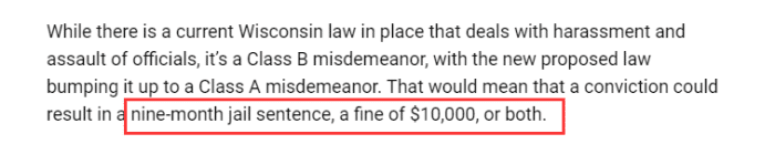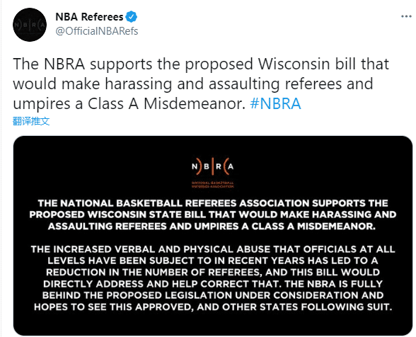 NBRA在声明中写道:裁判协会支持威斯康星州州的提议,该州将骚扰和攻击裁判和裁判员视为A级轻罪。近年来,各级裁判遭受的语言和身体攻击增多,导致裁判员人数减少,这项法案将直接解决一系列问题,NBRA完全依赖于正在审议的立法提案,并希望看到该法案获得批准,其他州也会效仿。