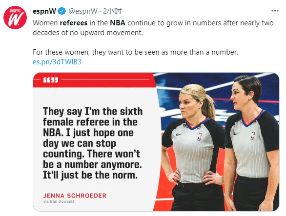 据报道,目前NBA女裁判数量在不断增加,联盟已经有6位全职女裁判,对此女裁判希望有一天不用再计数,让这成为一种正常现象。