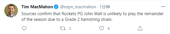 来源:直播车04-27 15:05直播车讯 北京时间4月27日,火箭核心球星约翰-沃尔提前赛季报销,据名记shams报道,火箭后卫沃尔因腿筋拉伤不会出战剩余的比赛,提前赛季报销;随后火箭记者麦克马洪证实,沃尔遭遇腿筋二级拉伤,本赛季不会再为火箭出战。此前篮网球星哈登也是因腿筋伤病而常规赛报销。