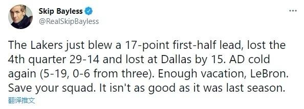 看完本场比赛之后,著名的NBA记者Skip也是在自己的社交媒体上发表了自己的看法,他认为目前湖人队是遇到了最为困难的情况,他们现在非常需要詹姆斯的回归来拯救球队。詹姆斯也已经缺阵有1个月左右的时间,伤病恢复的应该还是有条不紊,相信回归应该也是会在几周之内完成,但是湖人队现在是非常需要詹姆斯的存在,尤其是在进攻端,缺少詹姆斯的湖人队被限制得非常严重,加之戴维斯还是在寻找自己的状态,所以他的球队缺少稳定的得分点,进攻梳理也不流畅,这也使他们没有办法拿下比赛的胜利。