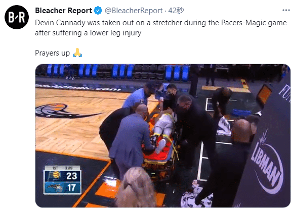 来源:直播车04-26 14:38直播车讯北京时间4月26日,魔术和步行者比赛中,场上发生意外受伤事件,魔术十天短合同球员德文-坎纳迪惨遭重伤,才上场仅打1分钟却不幸重伤离场,小腿严重受伤,被工作人员用担架抬离现场。