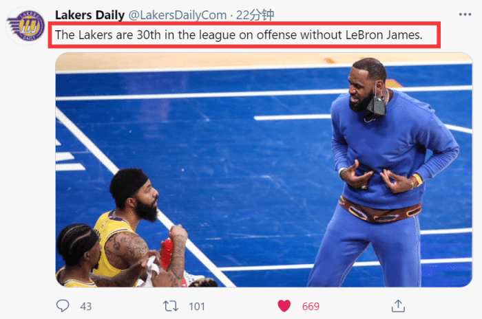 众所周知,在詹姆斯缺席后,湖人的防守仍然是全联盟数一数二,这非常鼓舞人心,也是他们战绩一直稳固在西部前五的关键!但球队进攻效率出现了断崖式的下滑,据美媒laker daliy表示:在没有詹姆斯后,湖人的进攻效率已经来到全联盟倒数第一!