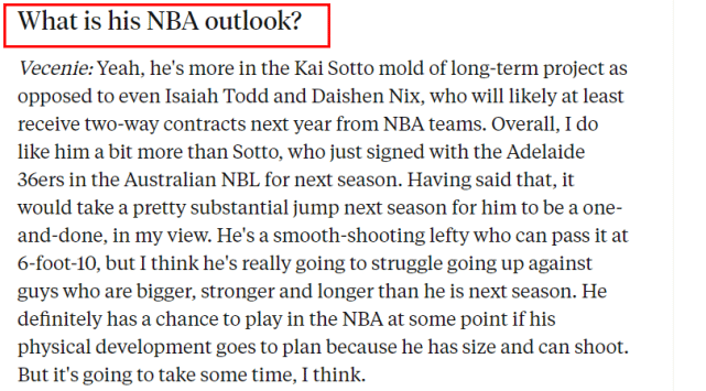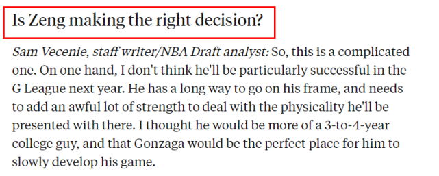 在NBA选秀专家萨姆-维切尼看来,这是一个复杂的问题。一方面,维切尼认为曾凡博明年在G联赛中不会特别成功。因为曾凡博还有很长的路要走,他需要增加很多力量来应对G联赛的身体对抗问题。相比之下,冈萨加可能更适合他慢慢提升自己的比赛表现。
