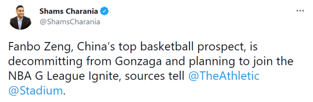 来源:直播车04-25 16:57直播车讯 北京时间4月25日,据The Athletic名记查拉尼亚报道,中国顶级年轻球员曾凡博将不会前往冈萨加大学,而是计划加入NBA发展联盟(G联赛)的点燃队。