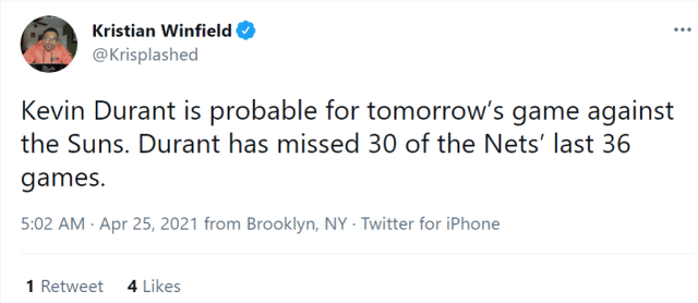 篮网官宣!杜兰特大概率明天复出战太阳,哈登等5人将继续缺阵