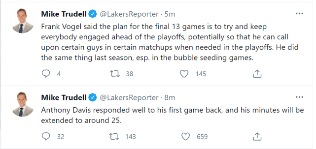 沃格尔还在采访中透露了湖人最后13场常规赛的计划。他希望在季后赛开始前,让全部球员都能参与到比赛中来。出于季后赛的需求,他可能会针对不同的对手,试验不同的阵容打法。跟队名记Mike Trudell表示,上赛季,沃格尔做了一样的事情,特别是在奥兰多赛区的排位赛阶段。