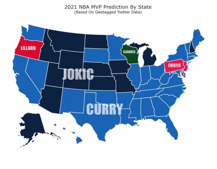 来源:直播车04-24 15:00直播车讯 对于NBA这种商业联盟来说,光有实力有些时候其实还是不够的,因为一个球星不仅需要赛场上的实力,在场外也需要有很高的人气。毕竟NBA很多奖项还有全明星的评选都需要人气来支撑,很多有实力却没有人气的球员可能都没办法进入全明星。而一家专门统计社交媒体数据的媒体就发布了一个NBA的本赛季MVP地图,上面有着美国各州球迷对于球星的支持力度,从这里可以看出这些州希望哪个球星拿到MVP。