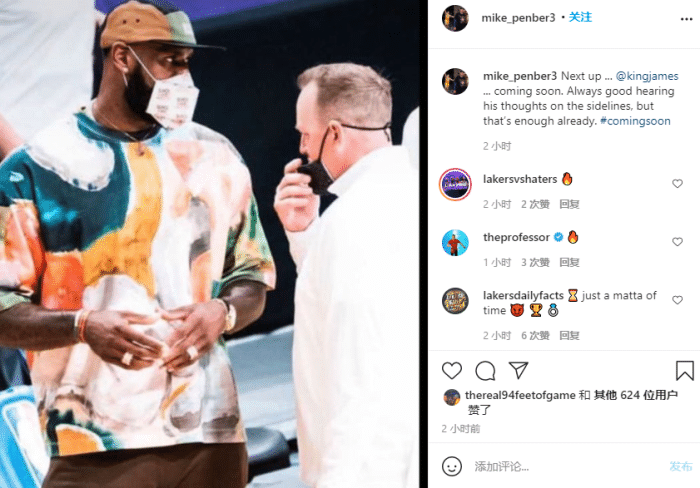 来源:直播车04-24 11:49直播车讯 浓眉复出之后又有好消息,勒布朗-詹姆斯即将复出,据湖人投篮教练Mike Penberthy 透露,他更新社交媒体,晒合影并且写道:湖人队下一个复出的是詹姆斯,很快回归,在场边听到他的复出想法总是很好的,这已经够久了。