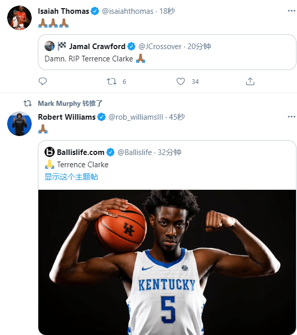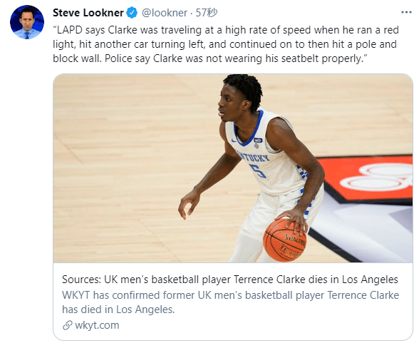 肯塔基大学官方已经确认这一噩耗,Klutch Sports经纪公司CEO富保罗已经发表声明:我们对失去特伦斯-克拉克的悲剧感到悲伤和悲痛,特伦斯是一个难以置信的,勤奋的年轻人;他为眼前的一切感到兴奋,准备实现自己的梦想;我们向特伦斯和他的家人祈祷。