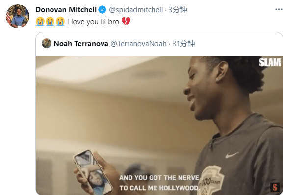 爵士球星米切尔发推:我爱你兄弟(心碎和痛哭的表情)