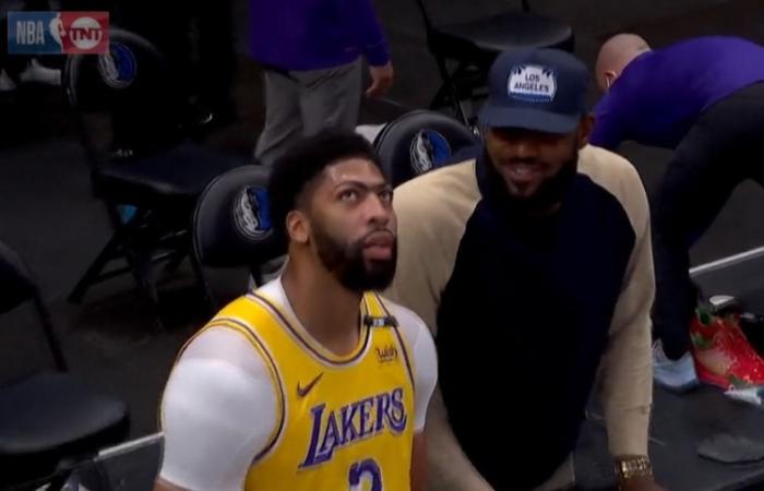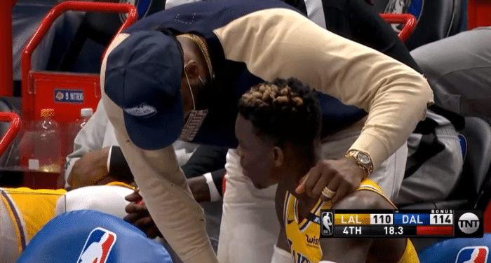 詹姆斯真领袖,因伤无法出战,但他随时准备安慰队友,上半场浓眉下场时,心情沮丧,用脚踢场边广告牌,当时詹姆斯第一时间走过来,安慰浓眉,如此心系队友,三旬老汉不愧球队真老大。