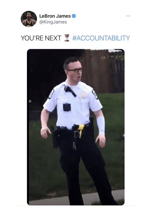 为什么这样说呢?在事情爆发后,詹姆斯在社交媒体上声援了黑人女孩,他贴出了了涉事警员尼古拉斯的照片,詹姆斯在照片上贴上了“追求责任”的标签,并且配文:你就是下一个。