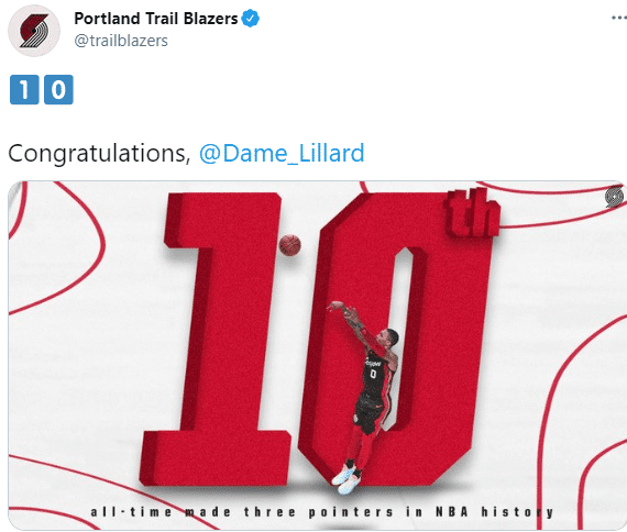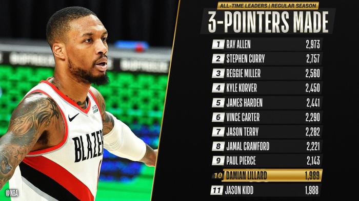 1989记三分!恭喜利拉德超越名宿破纪录,成为NBA历史第10人