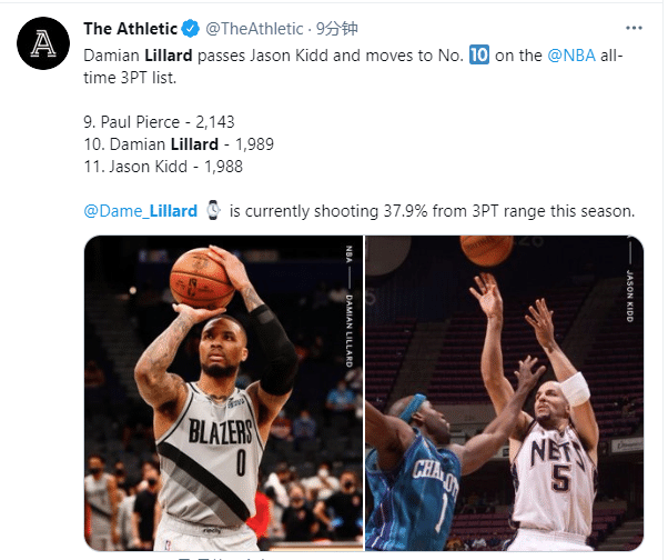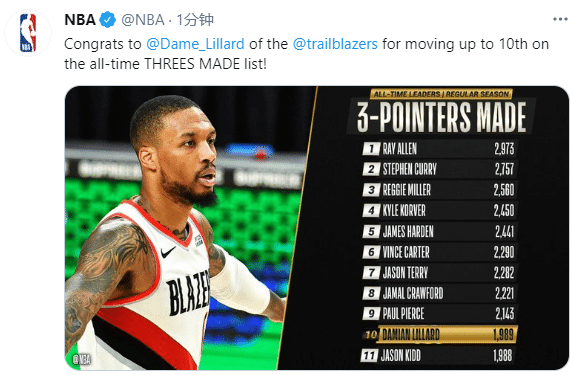 NBA官方第一时间恭喜利拉德超越基德破纪录。