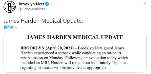 此前哈登先是遭遇大腿挫伤,休战两场后重返赛场,可哈登复出第一战,4月6日对阵尼克斯时伤势加重,伤势确诊为腿筋一级拉伤,可是在康复训练过程中,哈登伤势复发,被列为无限期缺阵;对此篮网主教练纳什表示:我们又回到了原点,哈登该回来的时候会回来的,可能是季后赛,也可能更快!