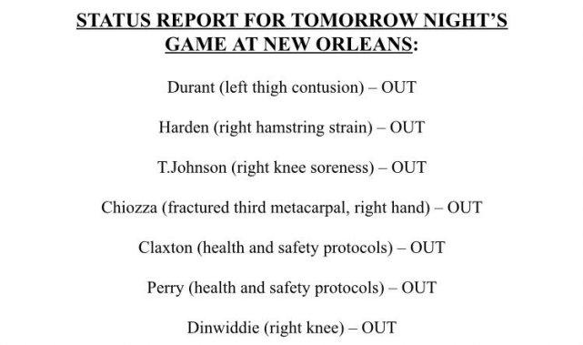 来源:直播车04-20 16:24直播车讯 北京时间4月20日,篮网官方公布了明天客场对鹈鹕的伤病名单,多达七名球员被贴上了OUT(缺席)的标签。杜兰特(左大腿挫伤)、哈登(右腿筋拉伤)、泰勒-约翰逊(右膝酸痛)、齐奥扎(右手骨折)、克拉克斯顿(健康安全协议)、佩里(健康安全协议)、丁威迪(右膝伤病)都不能出战这场比赛。这意味着欧文将单核带队来打这场比赛。