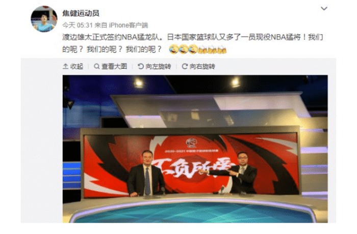 渡边签约猛龙的消息之后,焦健评论道:渡边签约了,我们呢?