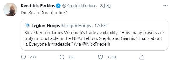 来源:直播车04-18 15:47直播车讯北京时间4月18日,帕金斯回应了科尔此前的言论,科尔此前在接受采访时表示现役仅詹姆斯、库里、字母哥是非卖品不会被交易,帕金斯转发了相关的推特并写道:“凯文-杜兰特已经退役了吗?”