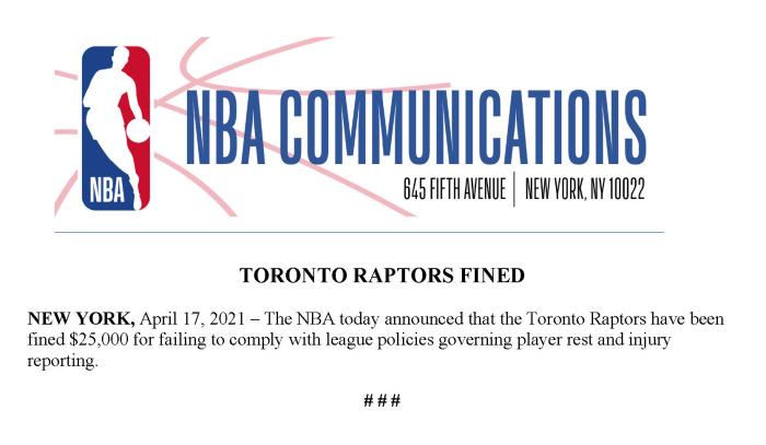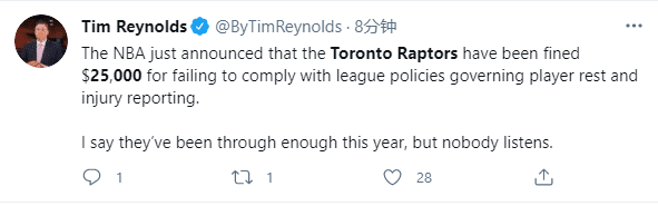 NBA官宣!猛龙违规被罚25000美元,名记:联盟早就受够了轮休