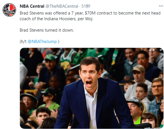 来源:直播车04-18 15:30直播车讯北京时间4月18日,据ESPN名记沃纳罗斯基报道,凯尔特人主帅布拉德-史蒂文斯拒绝了一份来自印第安纳大学7年7000万美元的主教练合同;少帅拒绝7年7000万美元大合同,年薪高达千万美元,目前史蒂文斯年薪不详,去年他和球队达成提前续约合同。