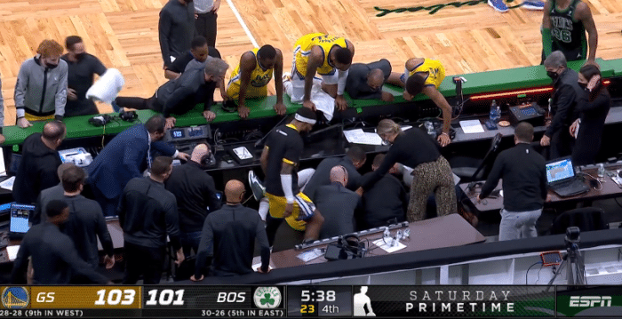 感人!库里受伤吃止痛药拒绝下场,勇士悍将摔出场外:疑似头破血流