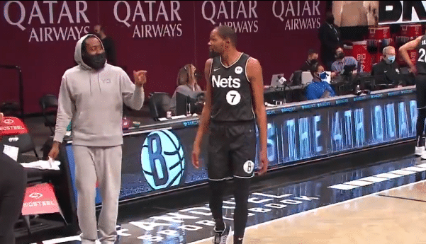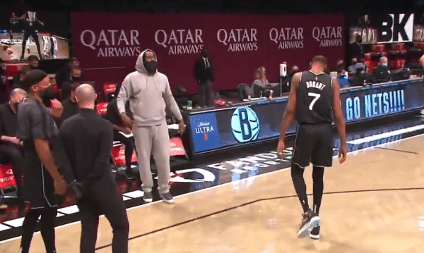 这是比赛进行到第四节,篮网已经取得大比分的领先优势,杜兰特上场之后和哈登互动,哈登本场比赛继续缺席,他在场边给队友加油助威。暂停期间,两人先是聊了一会,随后杜兰特回到场内,哈登则是依旧通过肢体动作和杜兰特进行互动。只见哈登手中有东西,不过在扔的时候他整蛊了杜兰特,而杜兰特连忙躲闪,如同默剧一样,两人都不说话,但动作很多,确实很有趣。