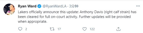 来源:直播车04-16 14:57直播车讯湖人巨头终于要复仇了,湖人对阵凯尔特人赛前,沃格尔透露安东尼-戴维斯已经获得参加球场完整训练的许可,这意味着浓眉小腿伤势已经痊愈,虽然接下来几场比赛,浓眉不太可能出战,但这是浓眉复出的重大利好;湖人也已官宣这个喜讯。