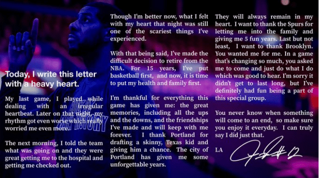 来源:直播车04-16 11:53直播车讯 篮网球星阿德在社交媒体上发布长文,正式宣布退役。这样的决定非常突然,尤其是在本赛季的阿德离开马刺,来到篮网追求生涯首冠。根据阿德的声明中可以看出,在和湖人的比赛结束之后,他心脏的问题变得严重,阿德称这是经历了最恐怖的事情之一,所以虽然目前阿德身体没有大碍,但出于健康和家庭层面的考虑,这位36岁的7届全明星宣布退正式役。
