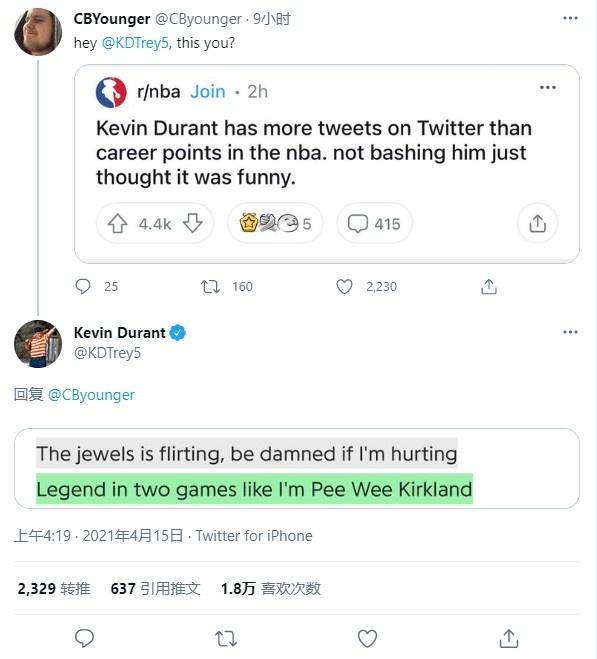 就离谱!美国网友:杜兰特推特数>生涯总得分,KD:我是两栖传奇!
