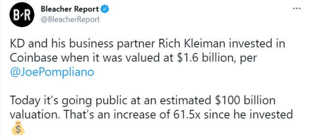 来源:直播车04-15 16:28直播车4月15日讯北京时间4月15日,据美媒Bleacher Report报道,篮网球星凯文-杜兰特和他的商业合作伙伴里奇-克莱曼之前投资了一家名为Coinbase的数字货币交易平台,当时这一平台的市值是16亿美元,而如今,这家公司以1000亿美元的估值完成上市,杜兰特因此从这笔投资中获得61.5倍的回报。