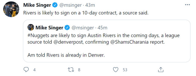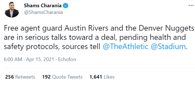 来源:直播车04-15 16:24直播车4月15日讯,据名记查拉尼亚报道,自由球员奥斯丁-里弗斯正在和掘金认真商讨签约。掘金记者跟进报道称,他将签下的是一份10天短合同,目前,里弗斯已经抵达丹佛。掘金后卫穆雷在对勇士比赛中遭遇十字韧带撕裂的重伤,赛季报销。掘金需要填补后场的漏洞,他们计划给小里弗斯一个机会。